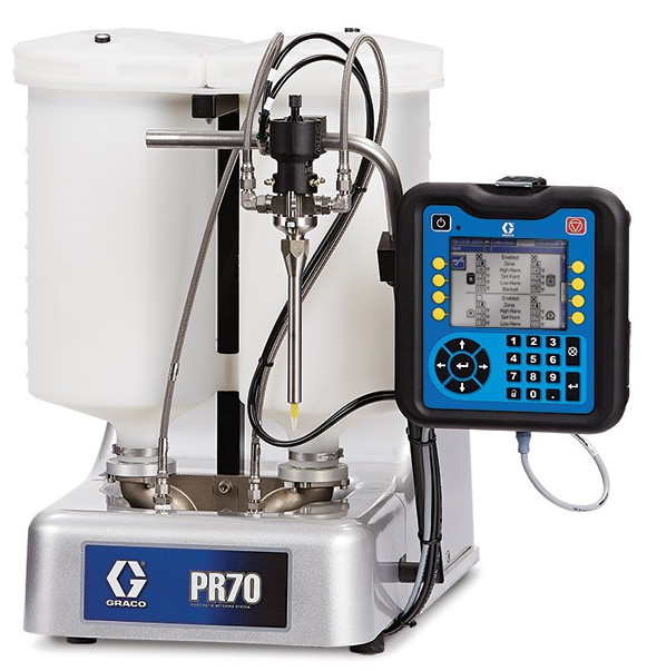 The Graco PR70 fixed and variable ratio systems accurately meter, mix and dispense medium-to-low viscosity materials for potting, gasketing, gasketing, encapsulation and syringe filling. All the features you need, in a compact, modular design.